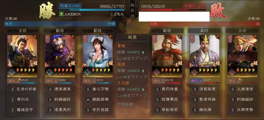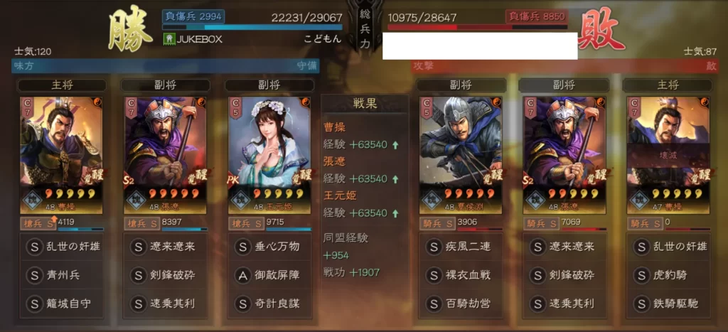 対盾兵種は思ったより戦えました。対藤甲兵であっても、主将抜き出来ている戦歴もちらほらとあります。対張角は速乗其利次第では被ダメを大幅に減少できます。対大尉盾は剣鋒破砕次第でいい勝負ができますが、基本不利な相性だと思います。