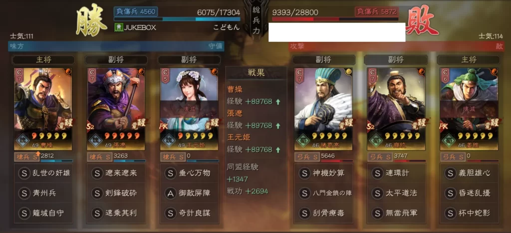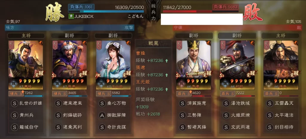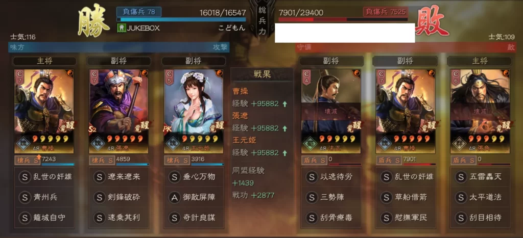 - 王元姫固有による与ダメ増は対象武将の手番で消失すること、主将ロックが効かない点はガッカリポイント