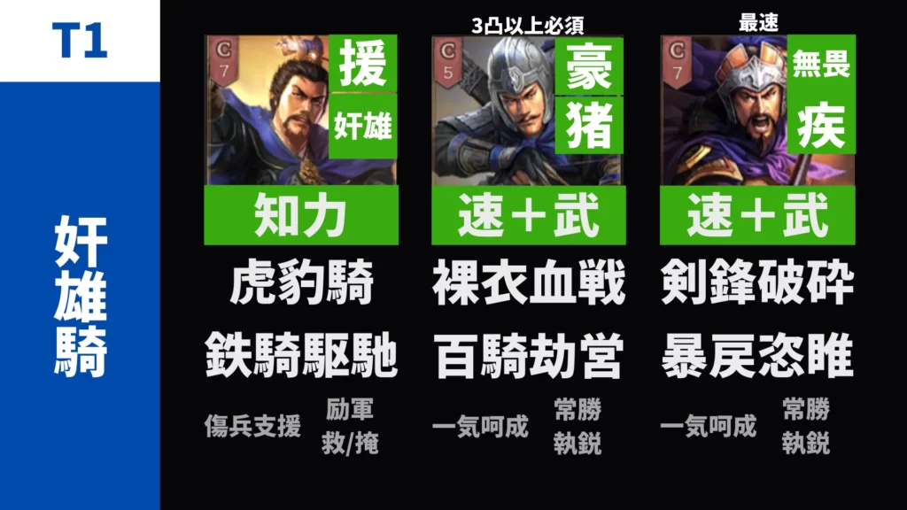 別名斬首騎馬。敵主将を狙い撃ちする編成。張遼に無畏がある場合は、夏侯淵を主将にし、張遼を副将にすると封印系編成の影響を受けなくなります。奸雄騎と違って安定感はあるが、火力がやや不足しがちな編成。