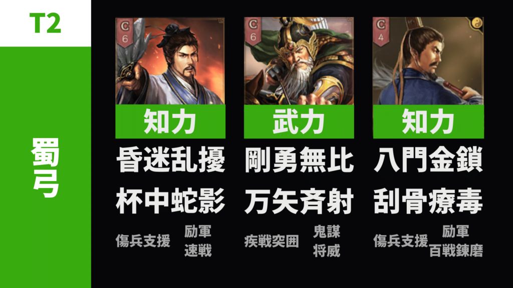 制御に弱いSP諸葛亮ですが、法正の固有で制御耐性を付けられる点は加点ポイント。刮骨療毒を採用できれば、傷兵支援の発動数も増えるでしょう。法正の兵種適性をS推奨ですが、他に候補があればそちらを優先でいいと思います。