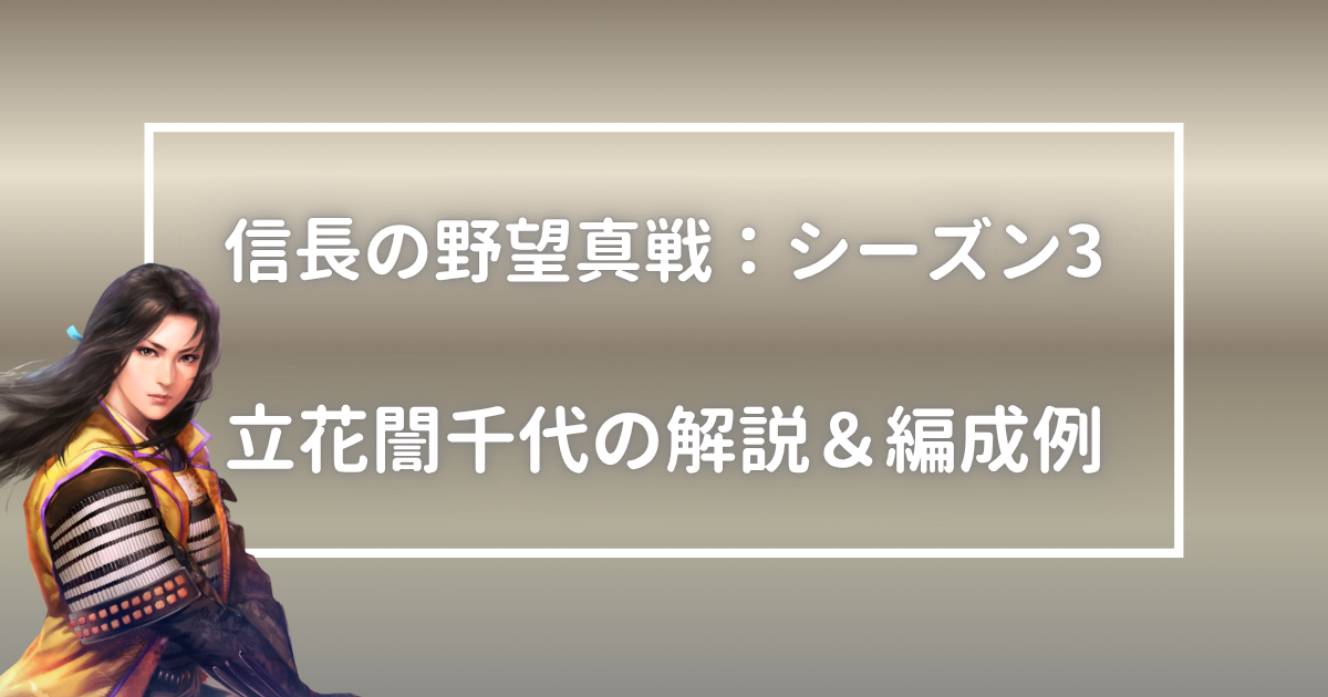 基本的には麻痺編成を構成する一人として使用します。立花誾千代+立花道雪までは確定として、霹靂一撃も組み入れて、麻痺編成を完成させます。いずれかのピースがかけている場合は強度が下がると考えてください。立花親子のほかに組ませる武将は自由枠となります。麻痺などの制御と相性が良い北条氏康や、家門一致+洞察の高橋紹運は特に相性が良い武将でしょうか。