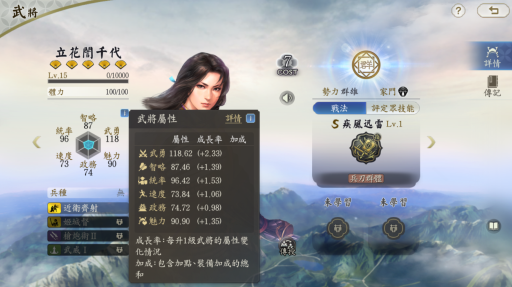 固有発動率・麻痺付与率・回復率・大将技とすべてに武勇の影響を受けます。武将特性の姫家督も武勇の影響を受けるため、立花誾千代は武勇値の影響が非常に強い武将ということが良くわかります。立花誾千代を編成するにあたっては武将特性の姫家督を活用したいので、1凸が最低限、可能であれば属性上昇の槍砲術Ⅱが獲得できる3凸が目標でしょうか。