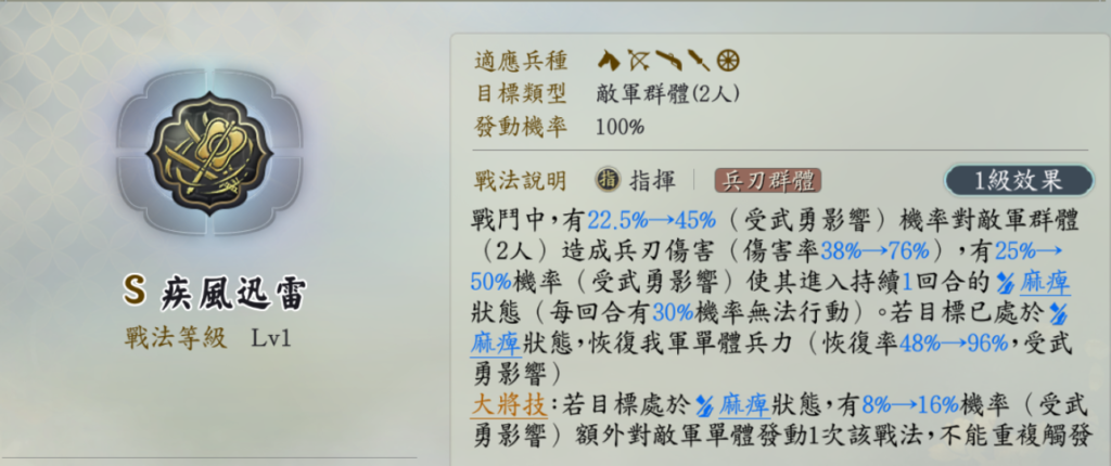 大将技: 目標が「麻痺」状態の場合、8% → 16%(武勇の影響を受ける)の確率で、敵軍単体に対してこの戦法をさらにもう一度発動する(重複発動不可)。