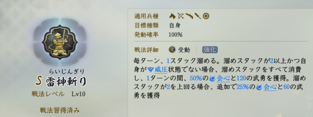 雷神切りは必須級の戦法だと思います。固有戦法は武勇の影響を強く受けます。また武将特性「姫家督」も武勇の影響を受ける回復効果です。雷神切りは火力増幅にもつながりますが、武勇を大幅に上昇させることで回復量も増やすことができます。また麻痺の付与率にも強く影響を与え、麻痺を維持できれば、立花道雪の火力も底上げできます。