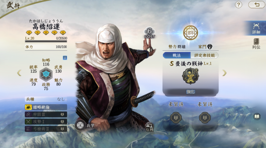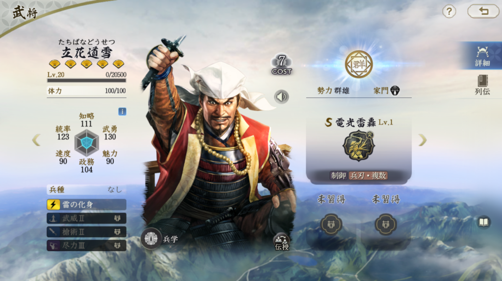 立花道雪の固有は、S3勇猛無前+霹靂一撃や独立独歩/縦横馳突/前後挟撃+乗勝追撃、兵刃火力を2種積むのもありです。S3勇猛無前は柿崎景家の戦法伝授です。