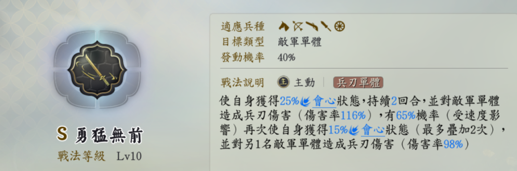 種類: アクティブ戦法 | 発動確率: 40% | 対象: 兵刃単体