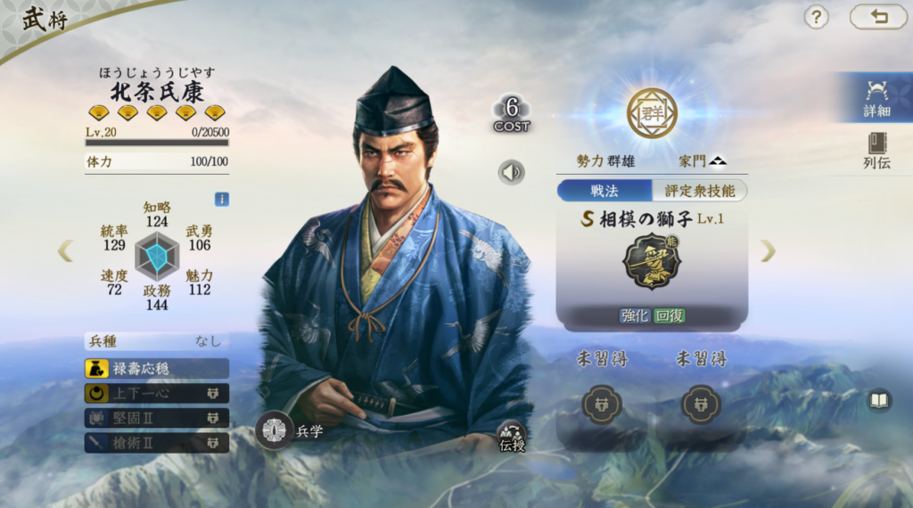 北条氏康は一行三昧/気炎万丈+回天転運が良いでしょう。一行三昧では鉄壁と回復+浄化の回転率を高め、気炎万丈では千軍辟易と合わせて多重制御が可能になります。序盤の連撃系編成にも対応しやすく、通常攻撃の手数を減らせば、より鉄壁を活かしやすくなります。